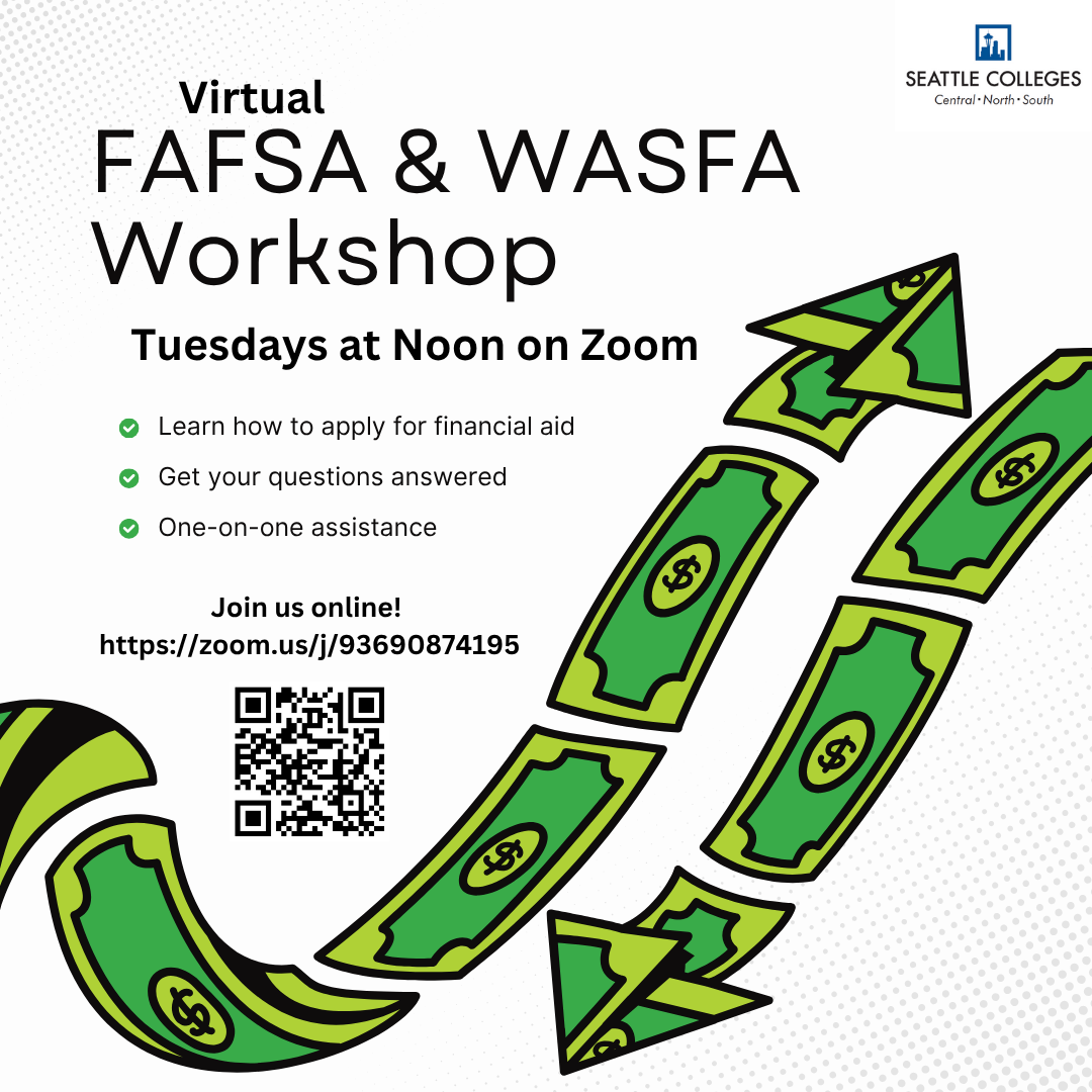 South Seattle College’s Financial Aid Office works to support equity and to increase opportunities for student access to and success in higher education by helping students seek, obtain, and understand all financial resources available to them. The Financial Aid Office provides information on student aid eligibility, types of aid available, and policies and guidelines for federal, state and institutional programs. Financial aid staff can assist you in completing the Free Application for Federal Student Aid (FAFSA) or the Washington Application for State Financial Aid (WASFA) or answer any questions along the way. Financial Aid staff will serve you well.